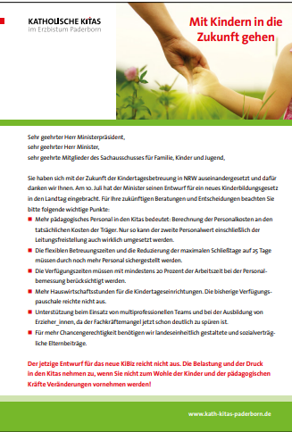 Über dieses alltägliche Engagement jeder einzelnen Einrichtung hinaus, verfolgen die katholischen Kindertageseinrichtungen die politische Lage in NRW ganz speziell. Als großer Träger im Feld der Kindertageseinrichtungen und als freier Träger gilt es auch, die politische Diskussion zum Wohle der Kindertageseinrichtungen mit zu gestalten und Änderungsbedarfe aufzuzeigen.